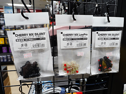 CherryMX ブランドの純正キースイッチ×10個セット。軸の違いで静音黒軸、静音赤軸、ロープロファイル赤軸の3種類が用意されており、店頭価格はいずれも1,738円。